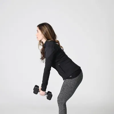 - با دمبلهای سبک در هر دست بایستید و تا زاویه ۴۵ درجه از مفصل ران خم شوید.